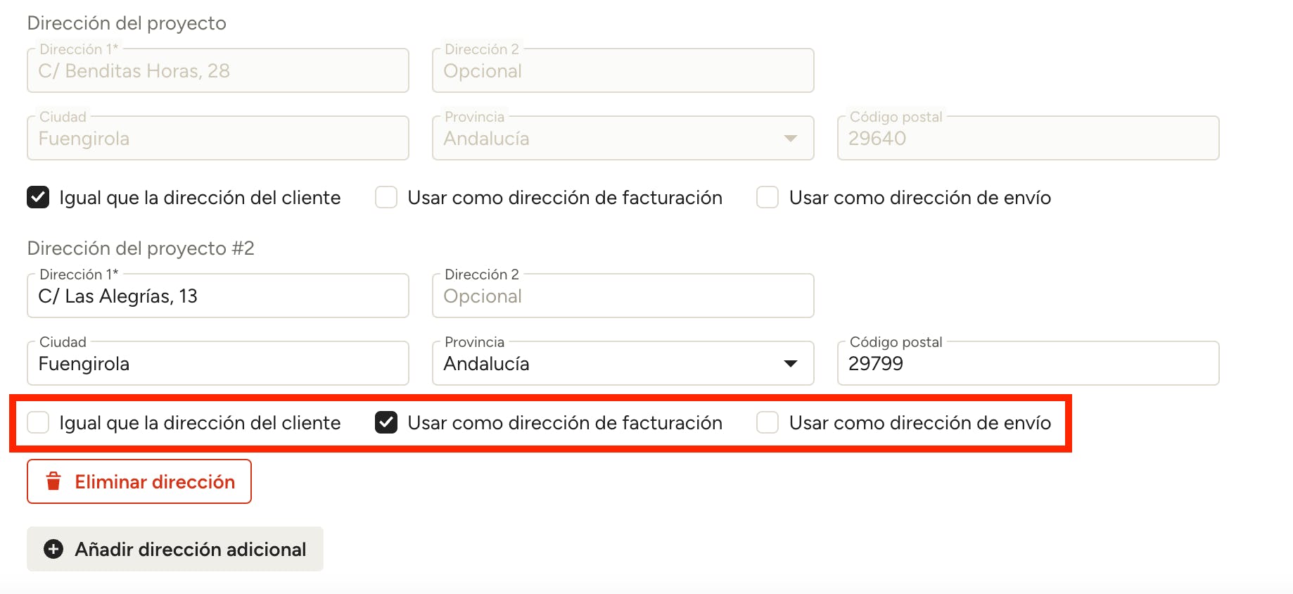 Cuando la hayas añadido, puedes elegir si es la dirección del cliente, la dirección de facturación o la dirección de envío. Marca la casilla junto a la opción correspondiente y los cambios se guardarán automáticamente.
