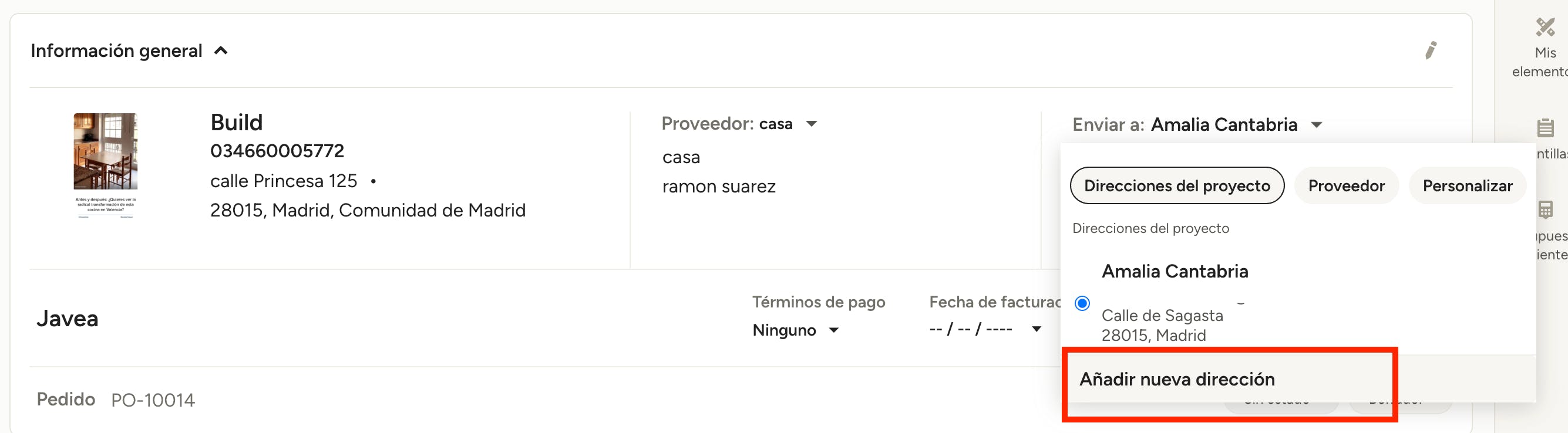 Entra en un pedido y abre el menú Enviar a que se encuentra a la derecha. Desde ahí pulsa el botón Añadir nueva dirección. Introduce la información y haz clic en Guardar. Ahora verás la dirección en el menú desplegable bajo las Direcciones del proyecto.
