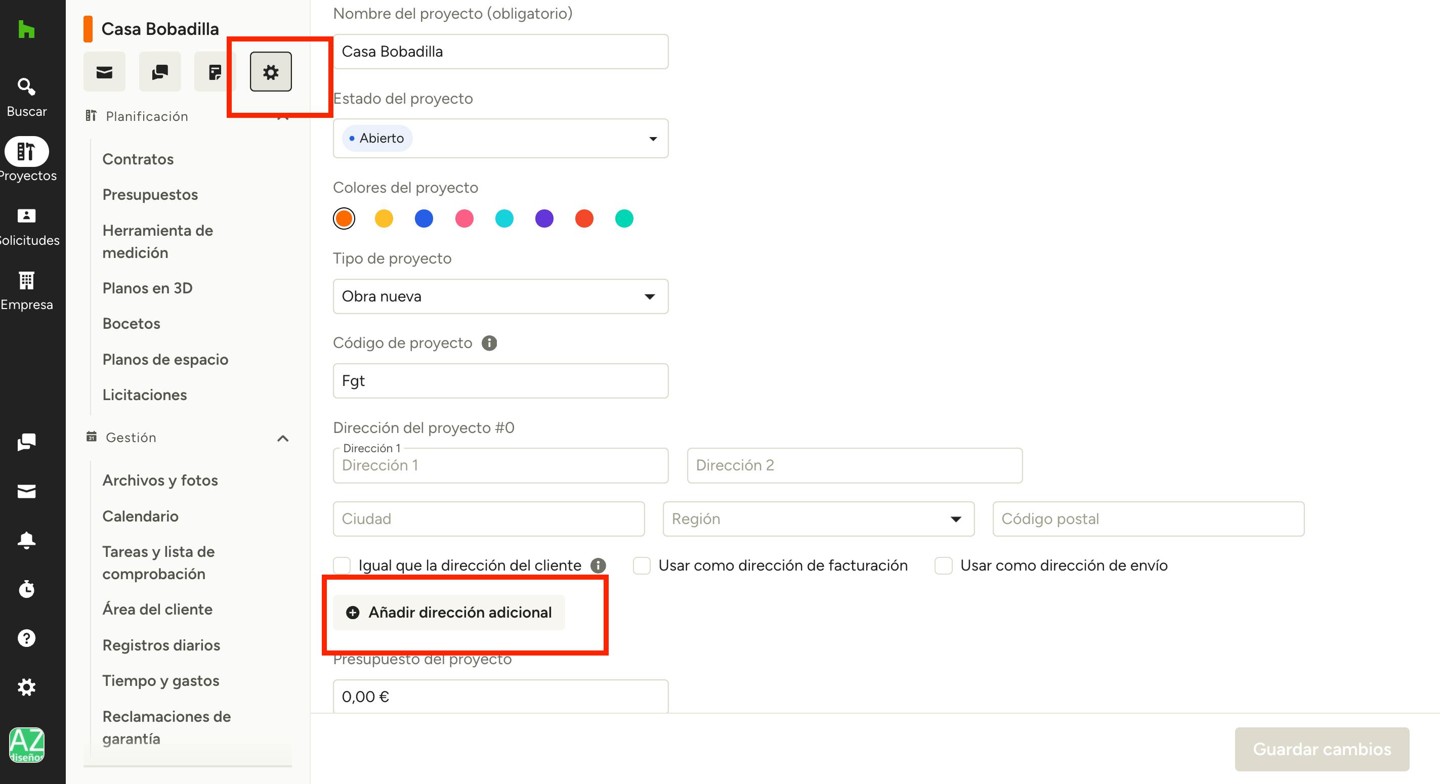Si quieres añadir una dirección adicional a un proyecto, como la del domicilio actual de un cliente además del lugar de trabajo, puedes hacerlo desde dos sitios.