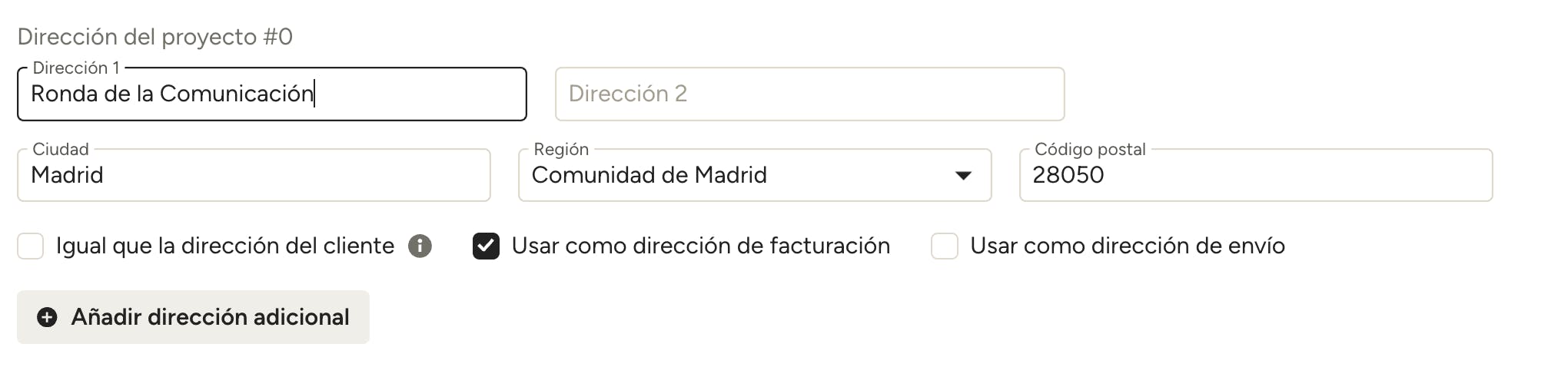 Desplázate hacia abajo hasta la sección Dirección del proyecto y haz clic en Añadir dirección adicional.