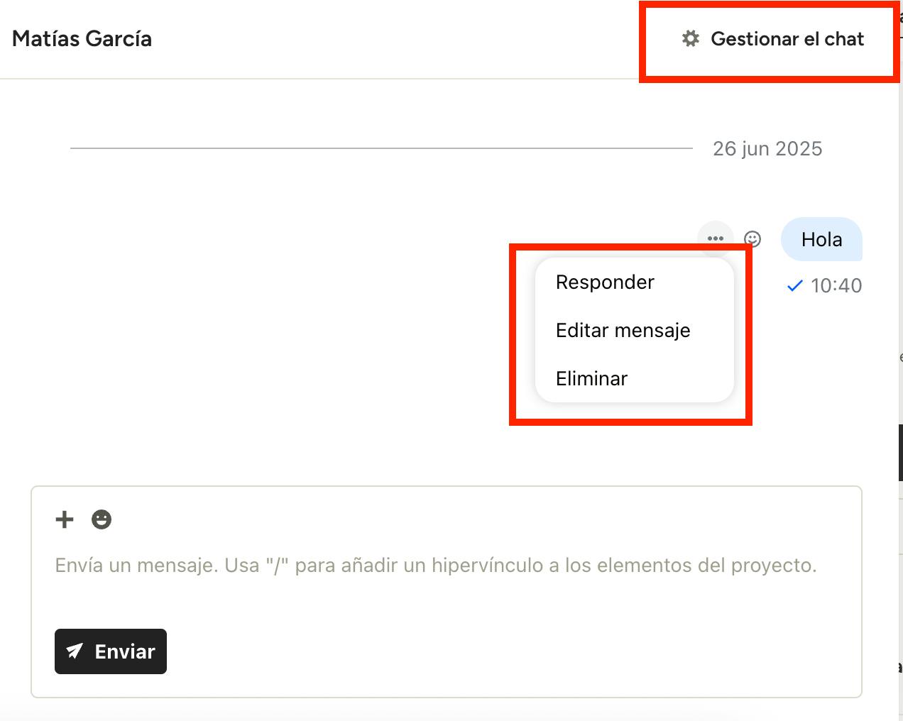 También puedes editar, eliminar o responder a un mensaje de chat general de la misma manera desde el icono de Chat en la navegación izquierda.
