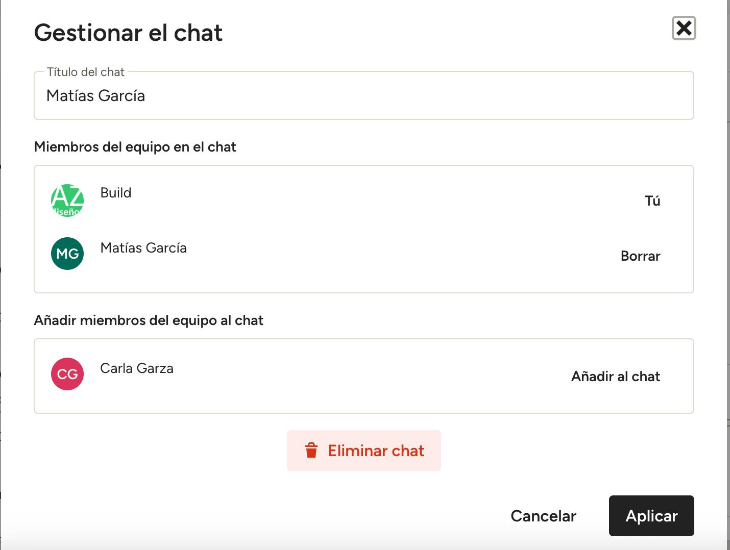 Aquí puedes realizar ajustes en el hilo de chat general: puedes cambiar el nombre, eliminar o añadir miembros del equipo y eliminar por completo todo el chat. Una vez realizados los cambios, asegúrate de hacer clic en Aplicar para guardarlos.