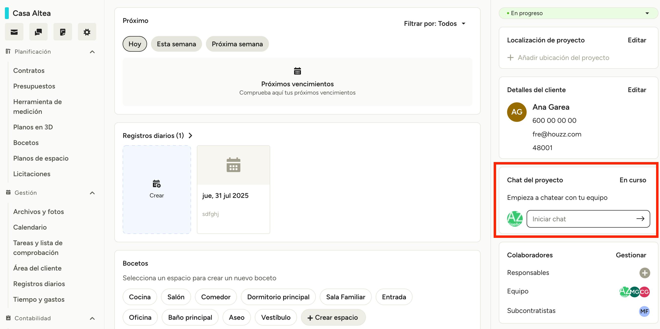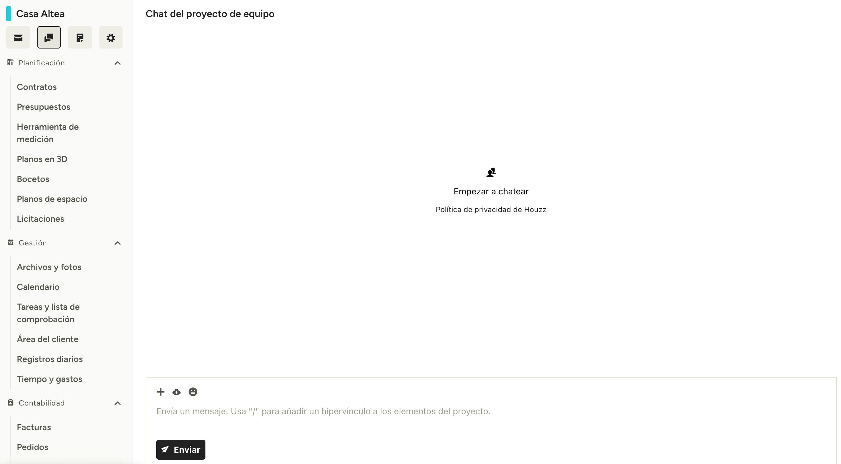 El chat de equipo de Houzz Pro te permite colaborar de manera eficaz con todos los miembros de tu equipo desde un único lugar, de forma que todos estéis al tanto del progreso de cada proyecto y conversación.