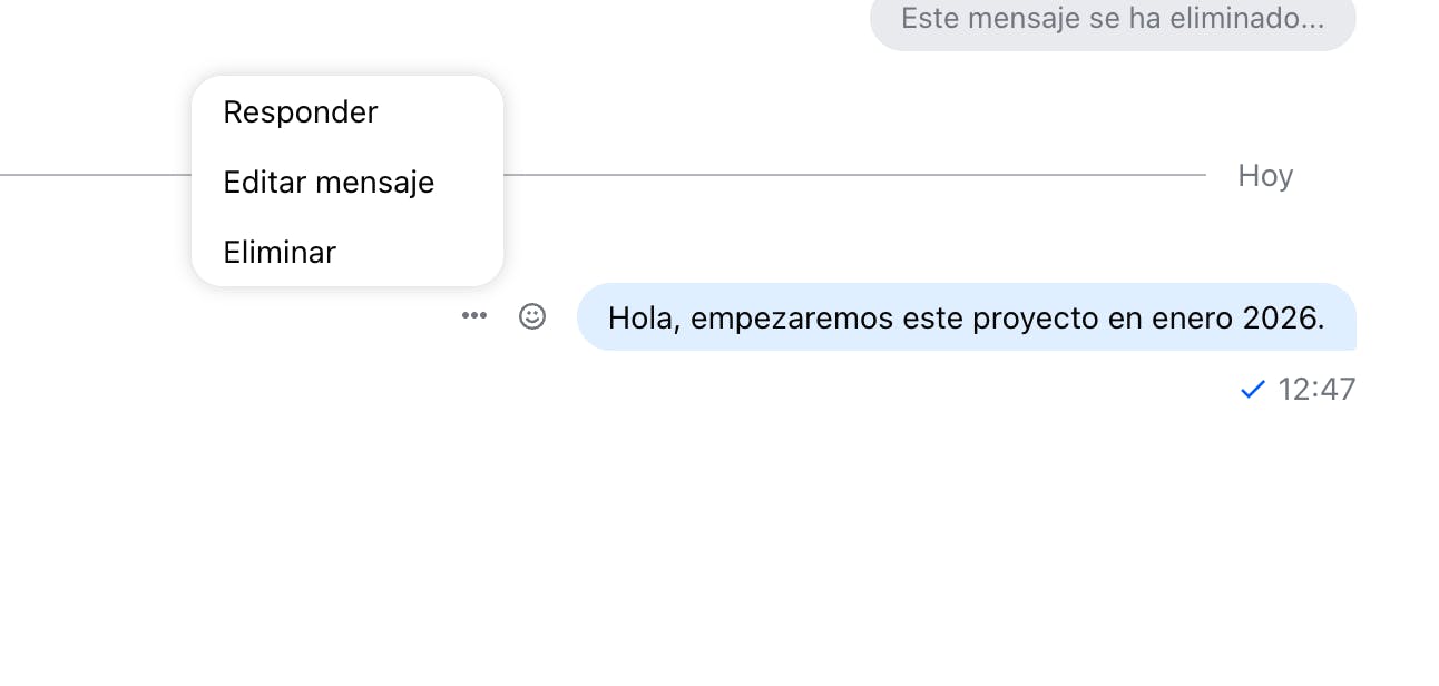 Para editar, borrar o responder a un mensaje, pasa el ratón por encima de un mensaje concreto y haz clic en el icono de los tres puntos. Puedes responder a cualquier mensaje, pero sólo puedes editar o borrar tu propio mensaje. Aquí también puedes hacer clic en el icono de la cara sonriente para añadir un emoji de respuesta a un mensaje.