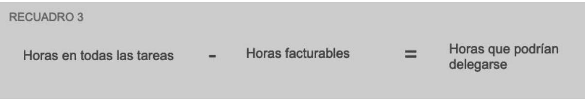 Es probable que tus ingresos generados por hora facturable (Recuadro 2) sean más altos que tus ingresos generados por hora (Recuadro 1). Esto se debe a que estás empleando tiempo en tareas para las cuales no estás ganando dinero como trabajar en tu página web o llevar a cabo la contabilidad de la empresa.