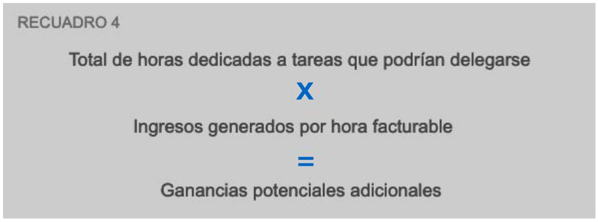 La cantidad de horas que pasaste trabajando en tareas que podrían haber sido delegadas representa el tiempo que podrías usar para generar más ingresos. Utiliza ese tiempo en tareas que solo tú puedes hacer. Averigüemos cómo: