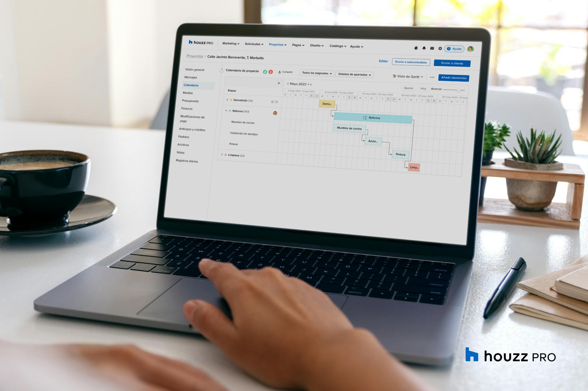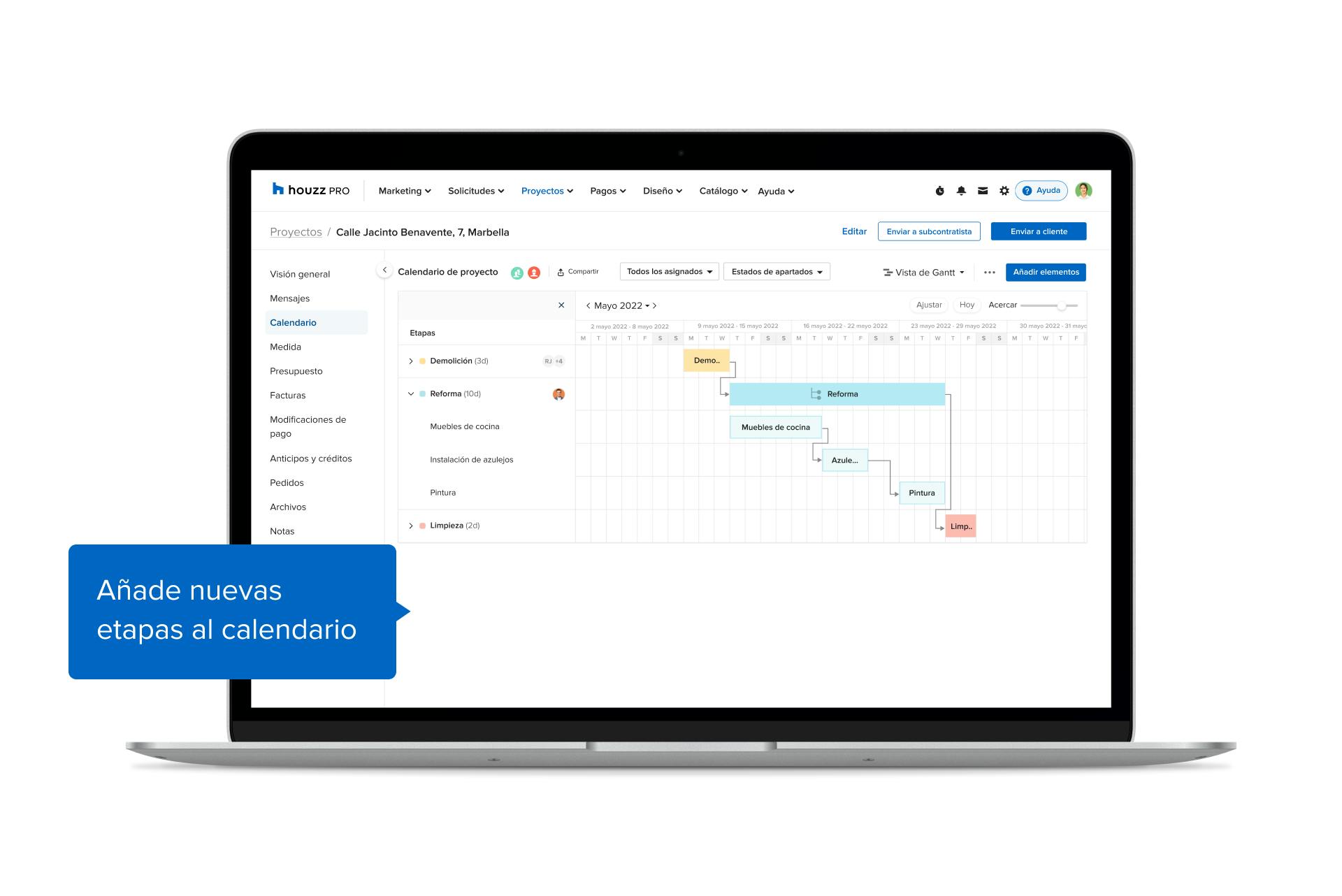 Houzz ha añadido recientemente nuevas funciones al Calendario de proyectos de Houzz Pro, la solución integral de gestión empresarial y de marketing para profesionales del sector del diseño y la reforma. Esta herramienta les permite planificar las fases y los plazos del proyecto, hacer un seguimiento de su progreso y compartir las novedades con todas las partes interesadas. Además, gracias a su formato en diagrama de Gantt, los equipos podrán organizarse de la forma más eficiente posible y asegurarse de que tienen todos los recursos necesarios durante cada fase del proyecto.