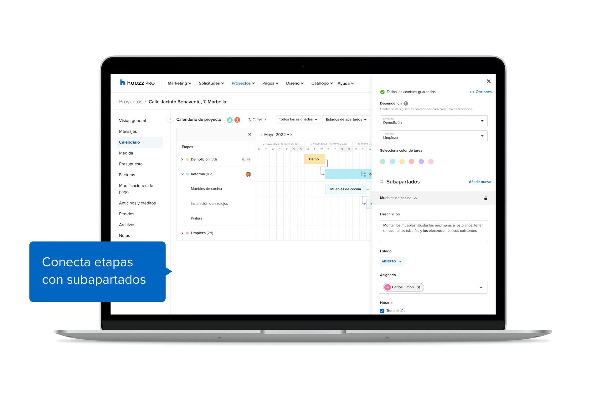 Por otro lado, los profesionales pueden añadir tareas y subtareas y vincularlas entre sí, escribir descripciones detalladas y asignar actividades específicas a los diferentes miembros del equipo. El calendario de proyectos es una herramienta disponible para todas las personas que cuenten con una suscripción a Houzz Pro. Como se ha hecho con el resto de funciones de Houzz Pro, hemos ido mejorando el calendario de proyectos en respuesta a las necesidades de nuestra comunidad.«El calendario de Houzz Pro te permite llevar una organización óptima, hacer un seguimiento de cada fase del proyecto y tener a todo el mundo al día de los cambios o las novedades ―explica Alon Cohen, presidente y cofundador de Houzz―.