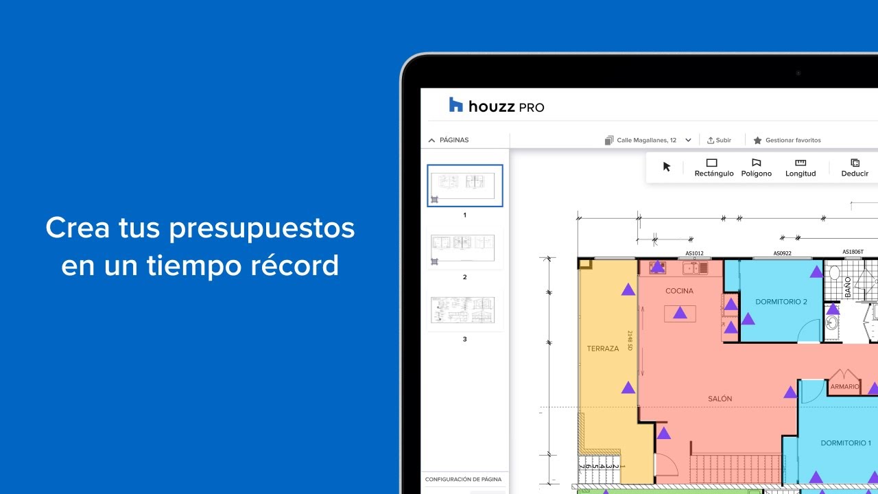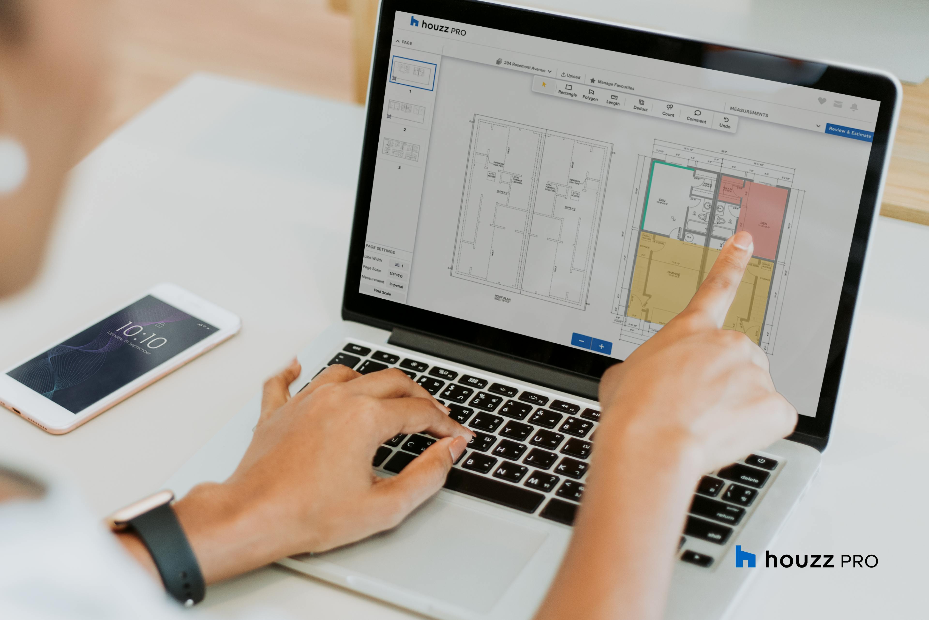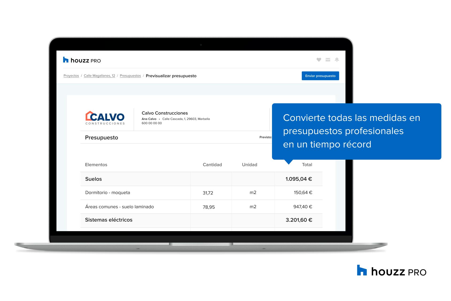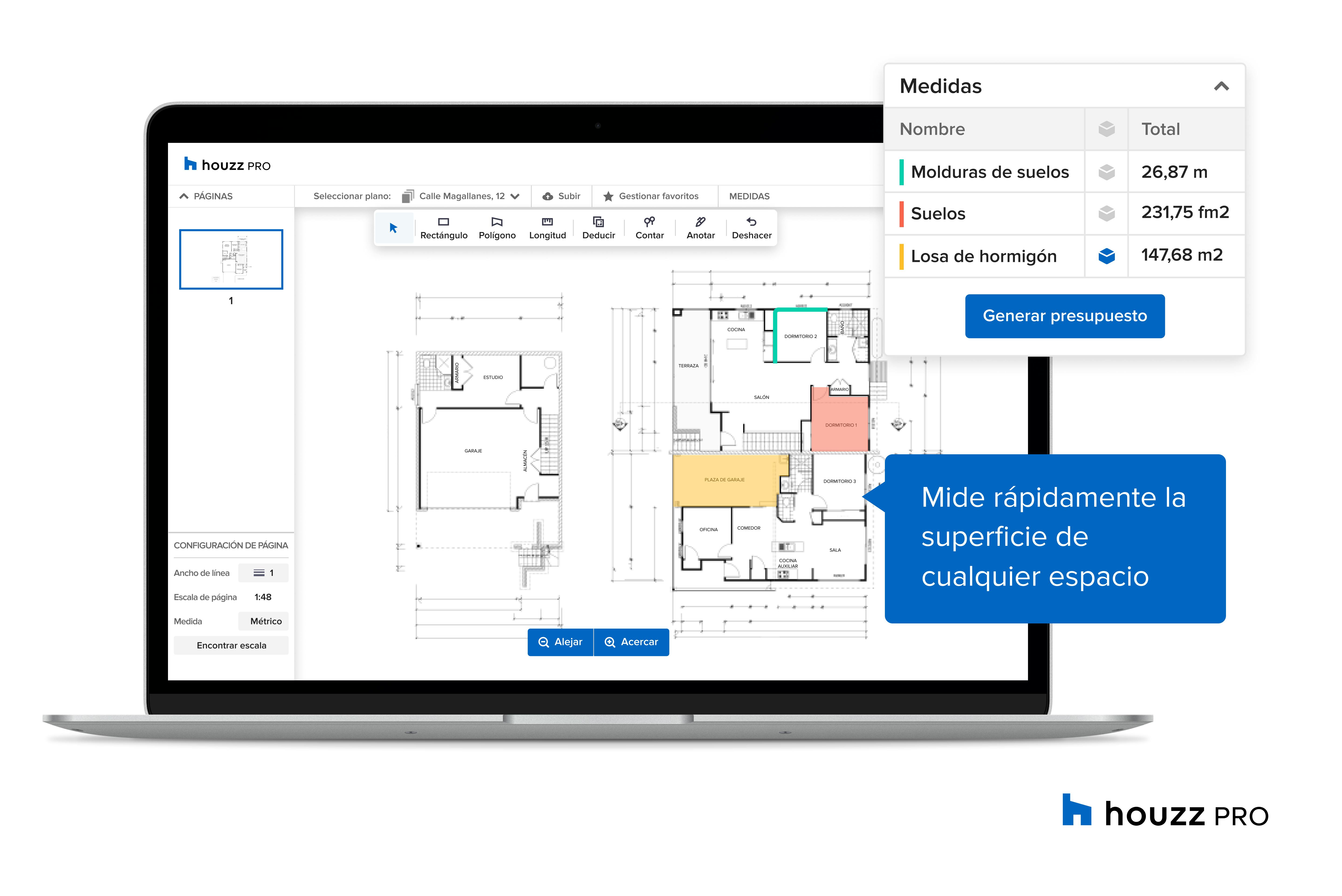 Hoy en día, los clientes esperan respuestas rápidas, un mayor compromiso y más transparencia que antes. La herramienta de medición para calcular presupuestos de Houzz Pro permite digitalizar y centralizar todo el proceso de estimación y lo pone al alcance de tu mano. Basta con subir tus planos a la plataforma para empezar a calcular tu presupuesto. Esta herramienta analizará los planos y te permitirá tomar medidas complejas ―longitud, volumen, superficie o recuento― de forma rápida y precisa. Además, te permite organizar la información por componentes del proyecto: tejado, baño, cocina, etc. En cuestión de minutos, habrás creado un presupuesto profesional con todo lujo de detalles: envíaselo a tus clientes para que lo revisen y lo aprueben con un solo clic.