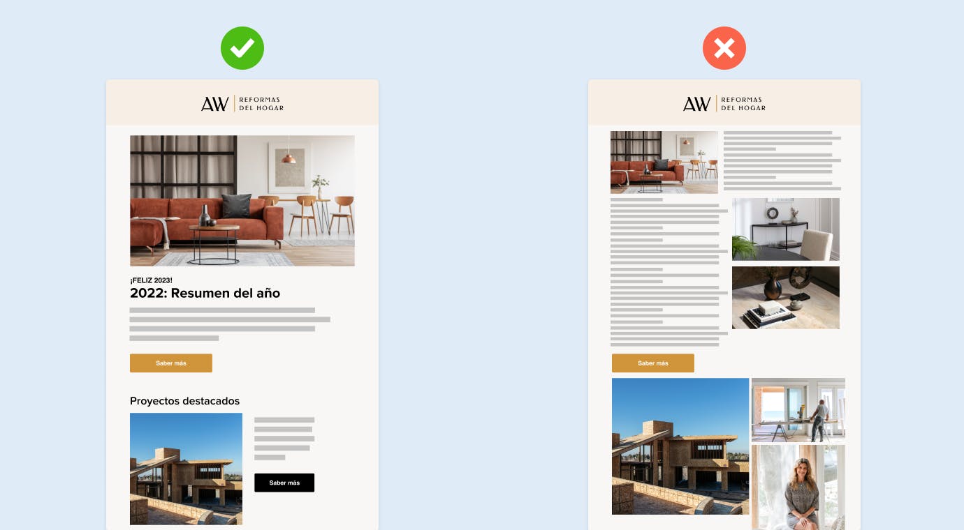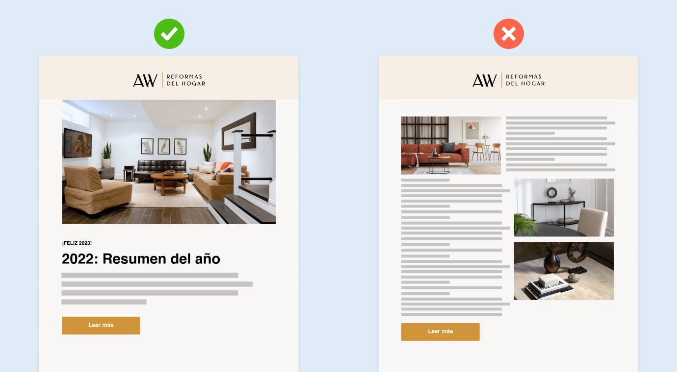 Destaca la información importante: a nadie le gusta perder el tiempo leyendo emails excesivamente largos o desestructurados. Guía a tus lectores colocando en un primer plano los contenidos más importantes, como las imágenes y los titulares. Esto les permite saber qué deben mirar primero y a dónde deben dirigirse para leer lo que realmente les interesa.