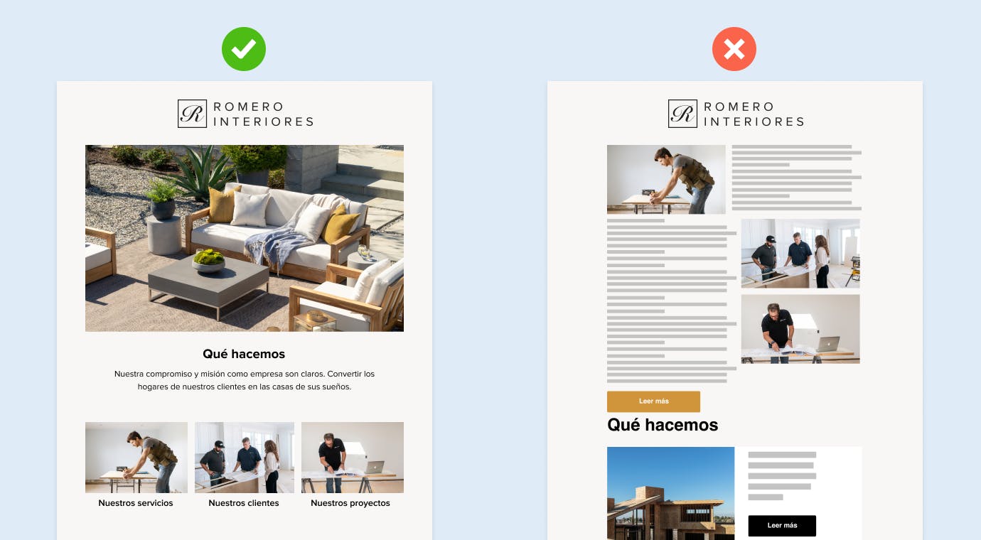 Calidad: la calidad de una imagen influye mucho en la respuesta emocional que provoca un correo electrónico, así que, antes de enviar a tus clientes un mensaje con imágenes, envíatelo a ti a modo de prueba. De este modo, puedes asegurarte de que el tamaño del archivo de la imagen no es demasiado grande ni demasiado pequeño y que las fotos se ven correctamente en todos los dispositivos, no solo en un ordenador.