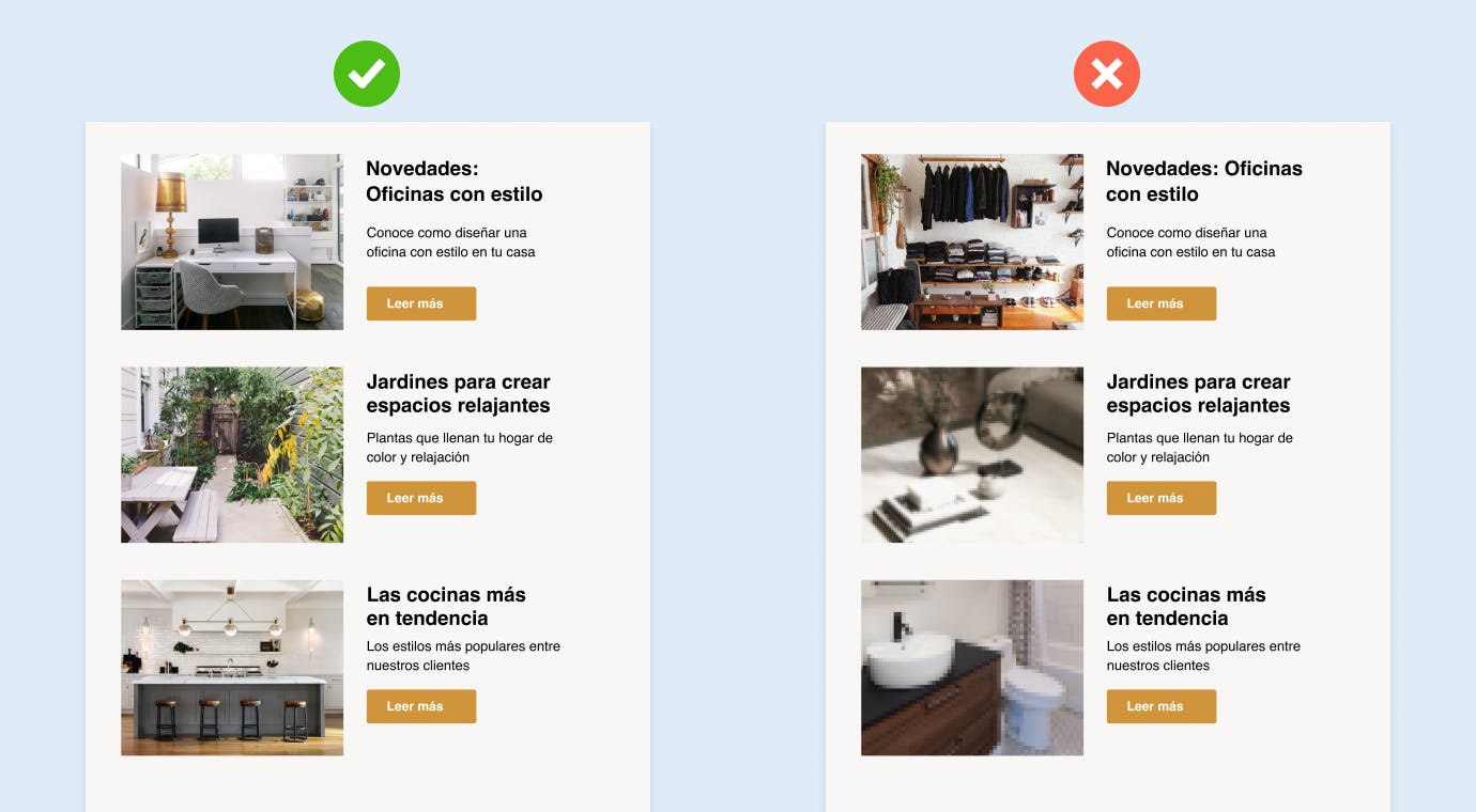 Relevancia: asegúrate de que las imágenes están estrechamente relacionadas con el texto del correo electrónico. De este modo, los lectores tendrán una referencia visual para entender mejor tu mensaje.