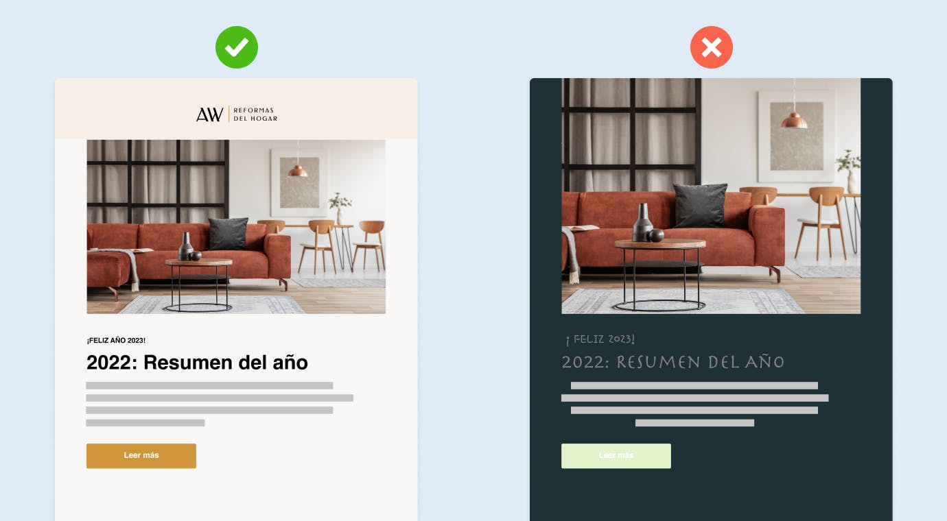 Crea contenido legible: Como ya hemos visto, además de causar una buena impresión y de estar en sintonía con tu marca, tus mensajes de correo deben ser claros y concisos, y han de estar redactados de forma que sean fáciles de leer. Así, procura que el contenido no sea ni demasiado denso, ya que tu público debe entender tu mensaje sin necesidad de leerlo entero.
