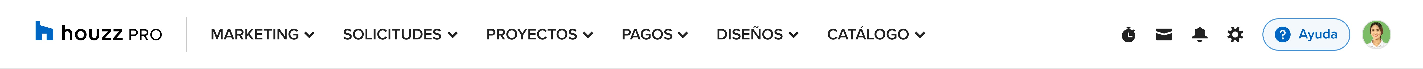 Para establecer o modificar tus opciones de configuración, accede a ellas desde el menú de navegación superior. Haz clic en tu foto de perfil y entra en el apartado de configuraciones de Houzz Pro.