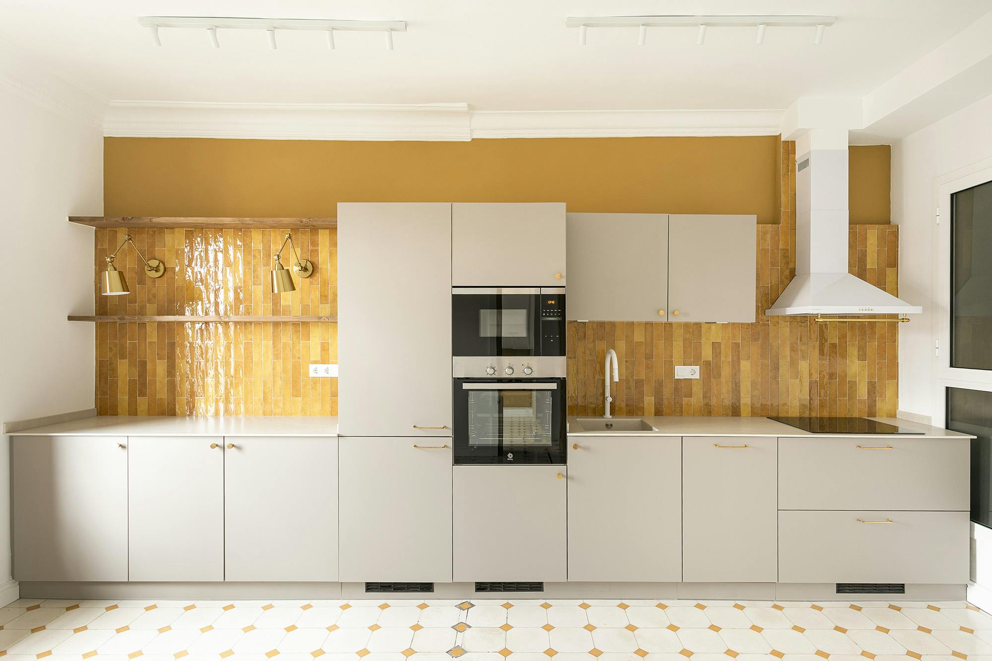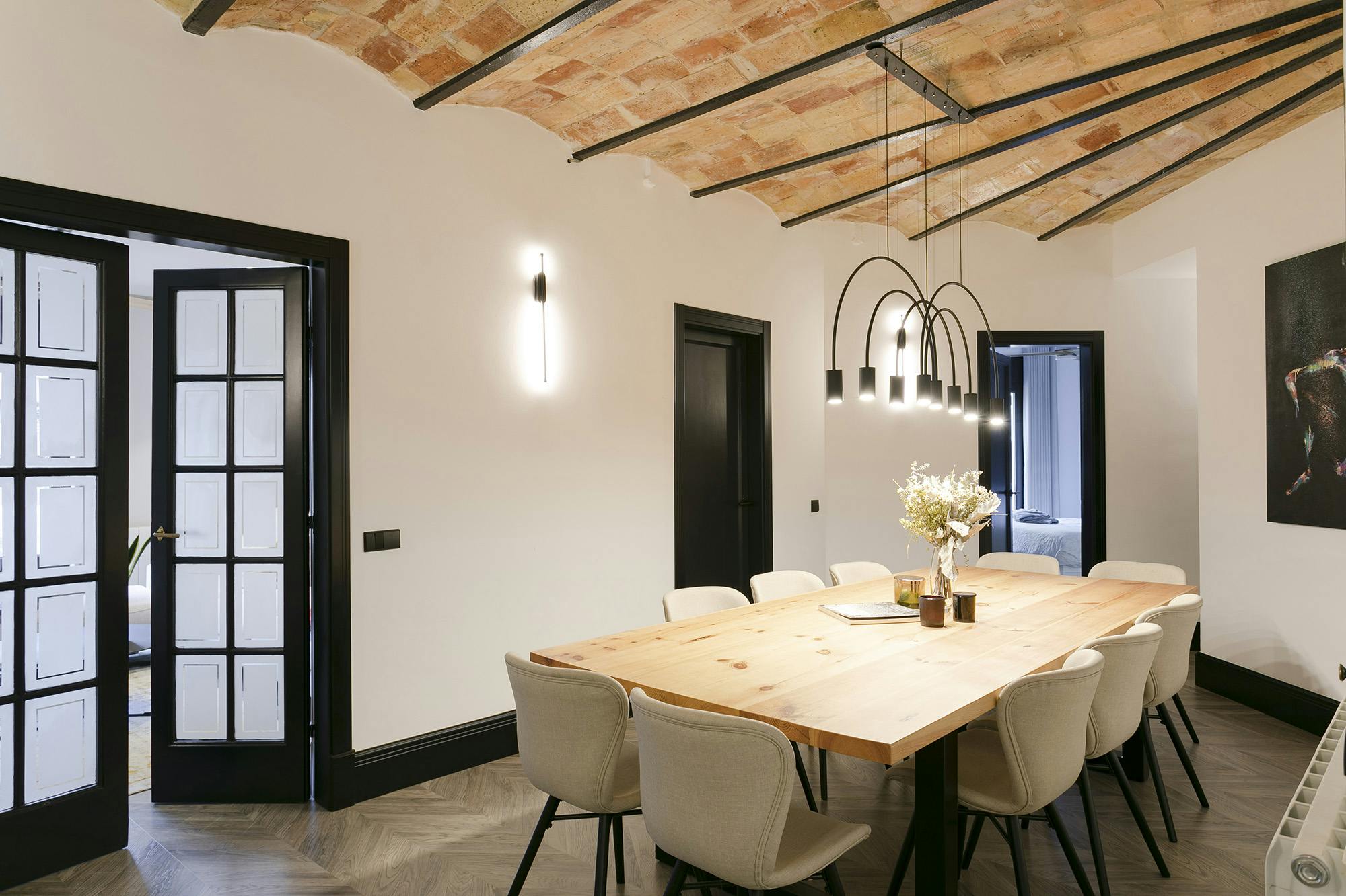 Una reforma integral de un piso de 160m2, para una familia de cuatro con un perro. Para mí es muy importante conectar con los clientes y que haya feeling. Creo que solo de esa manera se puede crear un verdadero hogar. Hemos logrado diseñar una casa de ensueño para los cuatro. La nueva distribución tenía que aprovechar al máximo los metros disponibles y crear espacios funcionales. Queríamos que los espacios comunes (cocina – comedor grande y salón) estuvieran bien conectados y abiertos. La mesa de comedor tenía que tener capacidad para al menos 10 personas. Al mismo tiempo, cada miembro de la familia tenía que tener su privacidad: los padres con un dormitorio principal con vestidor y baño, las hijas con su dormitorio y baño propio cada una. También, hemos logrado crear un espacio “multiuso” que era para visitantes o para ver pelis. El perro tenía su propio cuartito, junto al lavadero, con su propia ducha. Hemos restaurado materiales y elementos originales de la propiedad, ¡creando una casa única!